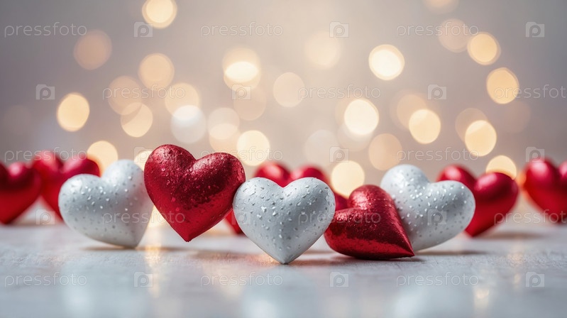 Крупный план красных и белых декоративных сердец на светлой поверхности с золотыми огнями боке, символизирующими любовь и романтику. Фон ко дню святого Валентина