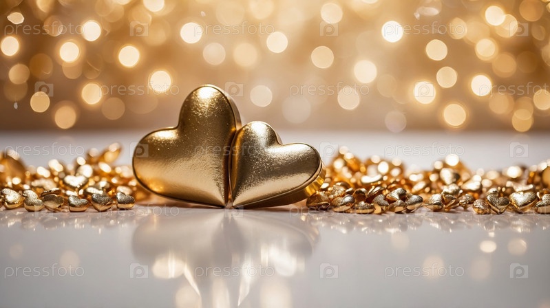 Крупный план золотых украшений в виде сердец на мягком светящемся фоне боке, создающих романтическую и роскошную атмосферу. День святого Валентина