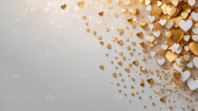 Золотые и белые сердечки элегантно разбросаны на мягком светлом фоне боке, символизируя романтику и праздник. Фон ко Дню Святого Валентина