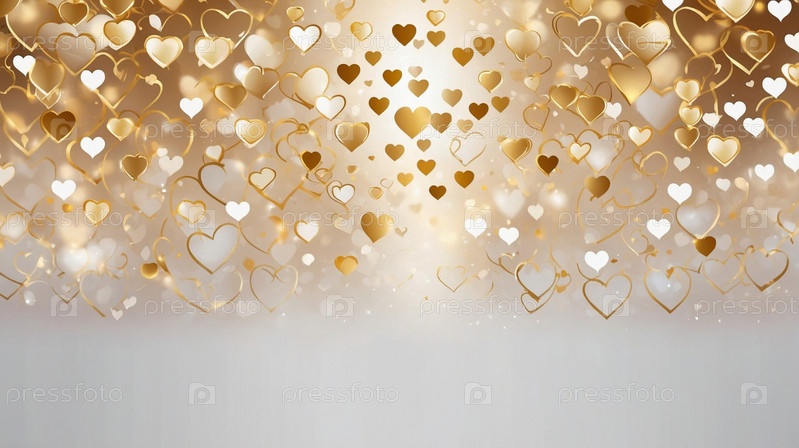 Золотые и белые сердечки элегантно разбросаны на мягком светлом фоне боке, символизируя романтику и праздник. Фон ко Дню Святого Валентина