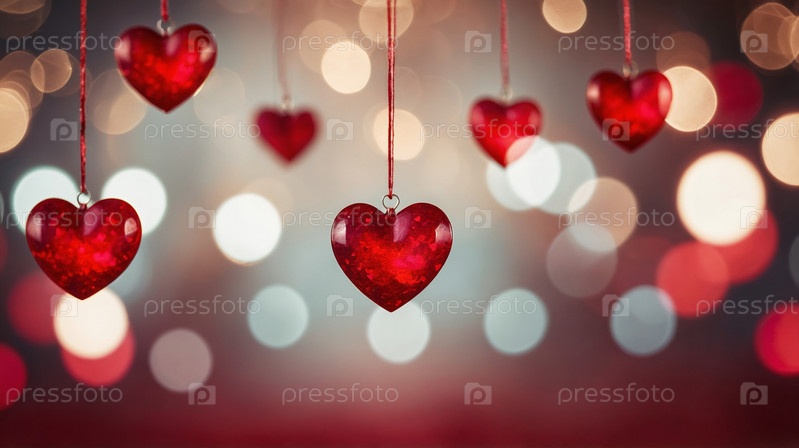 Блестящее украшение в виде сердца, висящего на ленте, окруженное мягкими боке-сердечками на розовом фоне. Концепция любви и романтики. Фон ко дню Святого Валентина