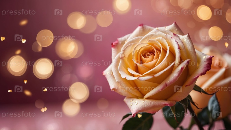 Крупный план нежно-розовой розы, окруженной золотыми украшениями в виде сердечек на фоне боке, символизирующем романтику. День святого Валентина