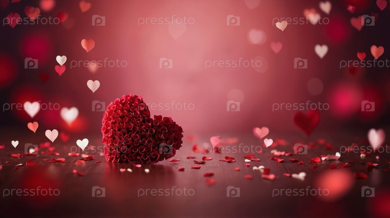 Букет из красных роз в форме сердца на темной поверхности, окруженный падающими лепестками в форме сердца, мягкий красный фон с эффектом боке, романтическая концепция, День святого Валентина