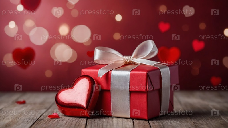 Красная подарочная коробка с белой лентой и красными сердечками на градиентном красном фоне, концепция романтики. День святого Валентина