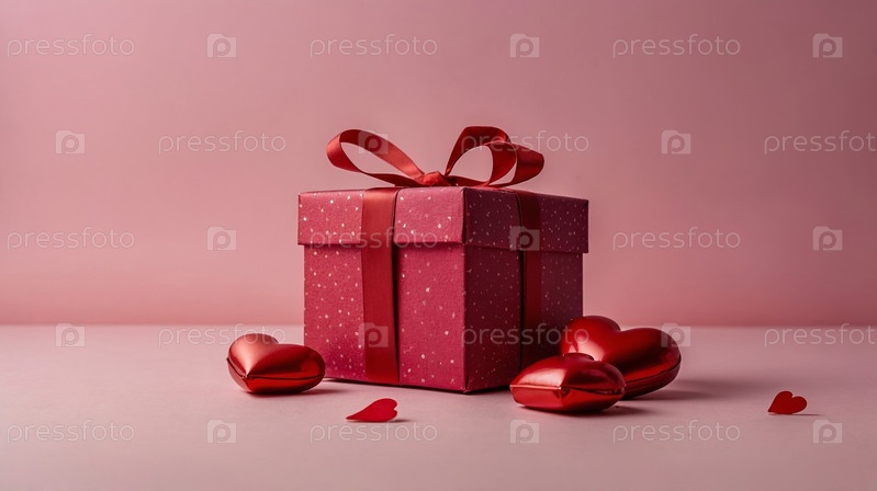 Розовая подарочная коробка с красной лентой, окруженная розами и красными сердечками на градиентном розовом фоне, концепция романтики. День святого Валентина