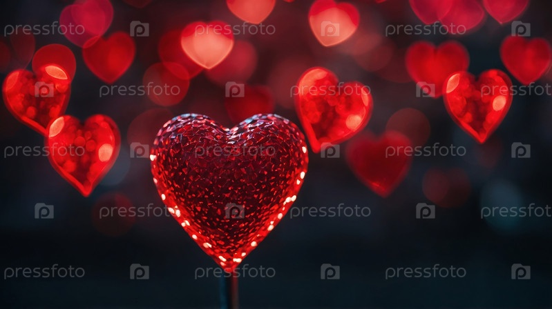 Блестящее украшение в виде сердца, висящего на ленте, окруженное мягкими боке-сердечками на розовом фоне. Концепция любви и романтики. Фон ко дню святого Валентина