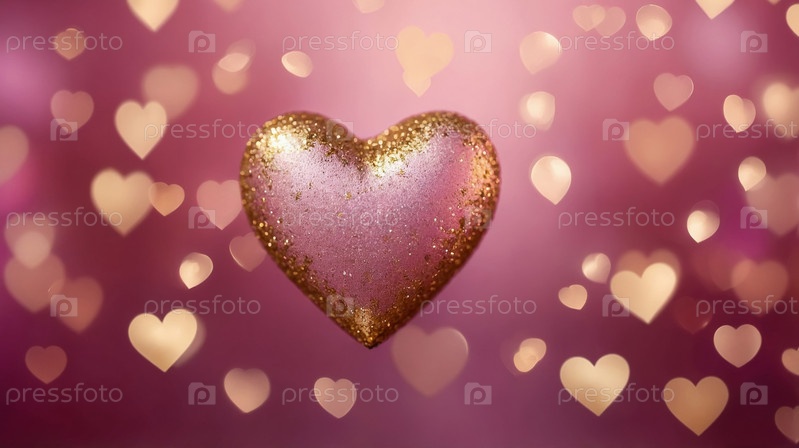 Блестящее украшение в виде сердца, висящего на ленте, окруженное мягкими боке-сердечками на розовом фоне. Концепция любви и романтики. Фон ко дню святого Валентина