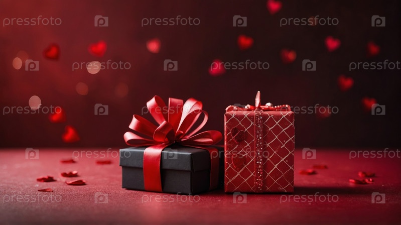Красная подарочная коробка, перевязанная атласной лентой, на красном фоне, с красными плавающими лепестками, символизирующими праздник и романтику. День святого Валентина