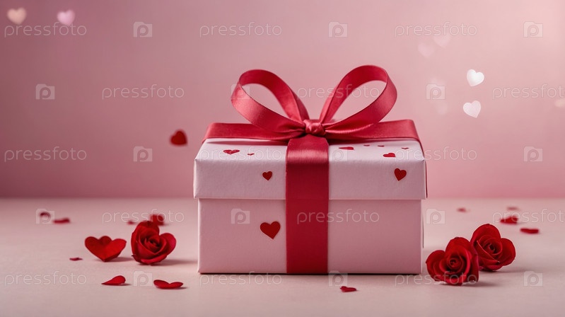 Розовая подарочная коробка с красной лентой, окруженная розами и красными сердечками на градиентном розовом фоне, концепция романтики. День святого Валентина