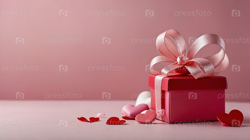 Розовая подарочная коробка с красной лентой, окруженная розами и красными сердечками на градиентном розовом фоне, концепция романтики. День святого Валентина