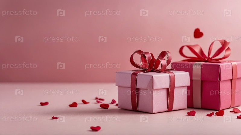 Розовая подарочная коробка с красной лентой, окруженная розами и красными сердечками на градиентном розовом фоне, концепция романтики. День святого Валентина