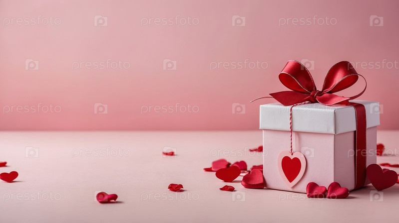 Розовая подарочная коробка с красной лентой, окруженная розами и красными сердечками на градиентном розовом фоне, концепция романтики. День святого Валентина