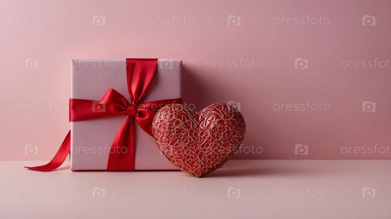 Розовая подарочная коробка с красной лентой, окруженная розами и красными сердечками на градиентном розовом фоне, концепция романтики. День святого Валентина