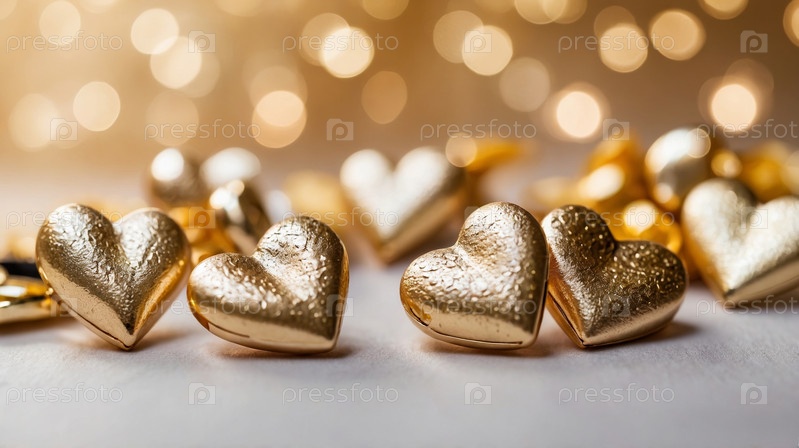 Крупный план золотых украшений в виде сердец на мягком светящемся фоне боке, создающих романтическую и роскошную атмосферу. День святого Валентина