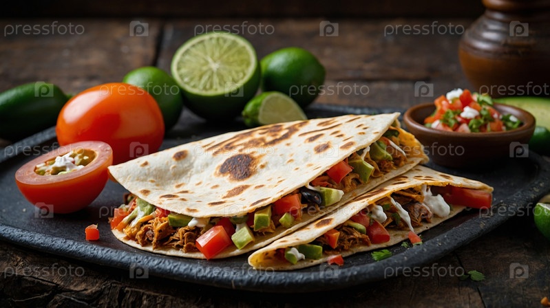 Тако с пикантным мясом и хрустящими овощами подаются на деревенском блюде в окружении свежих лаймов, помидоров и сальсы, демонстрируя яркую мексиканскую кухню