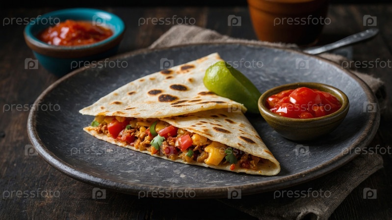 Тако с пикантным мясом и хрустящими овощами подаются на деревенском блюде в окружении свежих лаймов, помидоров и сальсы, демонстрируя яркую мексиканскую кухню