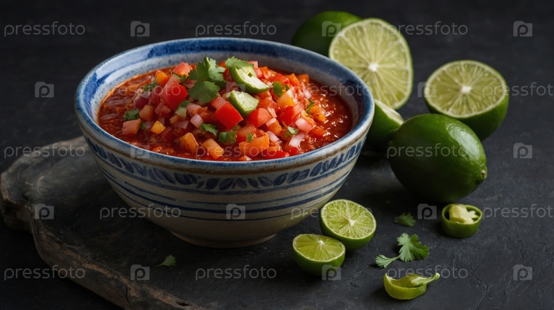 Яркая сальса из рубленых томатов, лука и халапеньо украшена кинзой и лаймом, а также подается с хрустящими чипсами из тортильи на темной деревянной поверхности