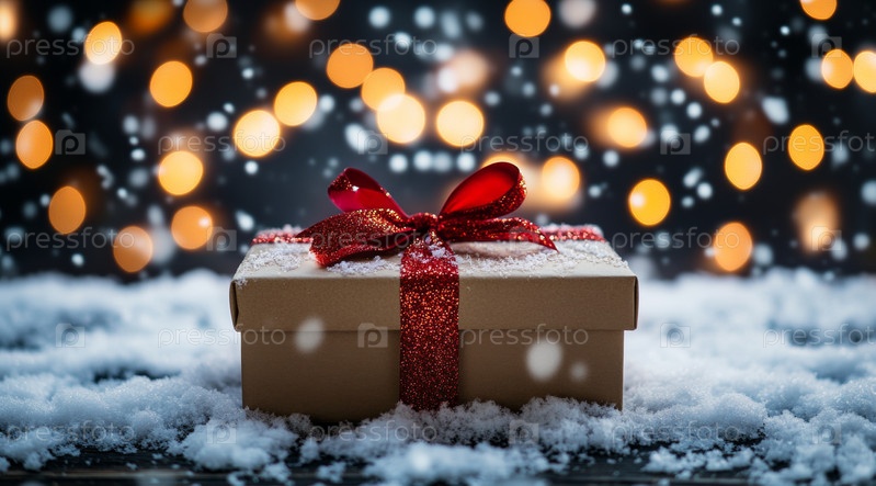 Праздничная подарочная коробка, украшенная красным бантом, стоит на деревянной поверхности во время зимнего снегопада