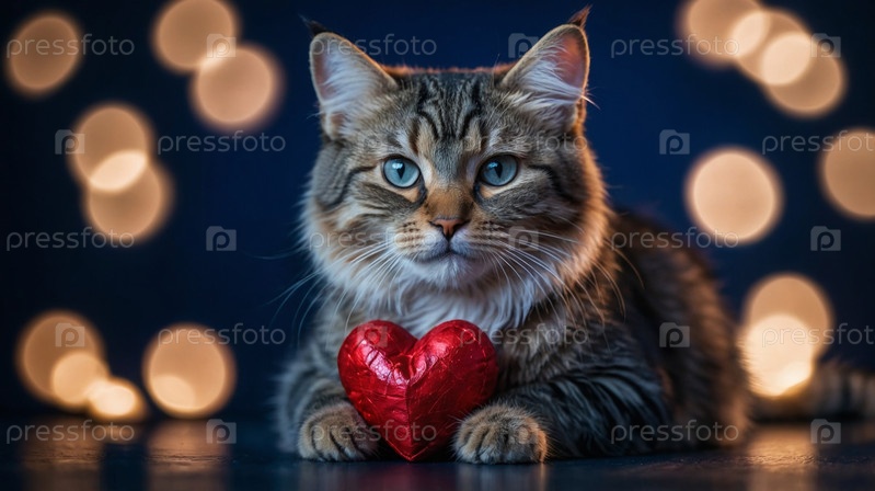 Очаровательный полосатый котенок держит красное сердце на блестящей поверхности с фоном боке, символизирующим любовь и привязанность. День святого Валентина