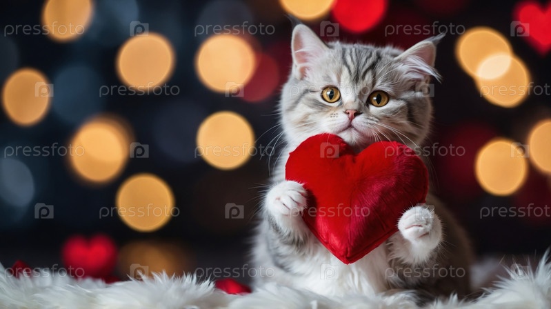 Очаровательный полосатый котенок держит красное сердце на блестящей поверхности с фоном боке, символизирующим любовь и привязанность. День святого Валентина