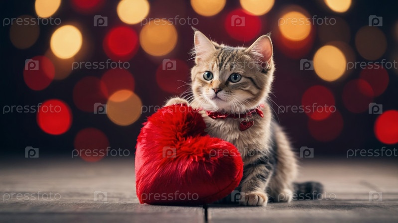 Очаровательный полосатый котенок держит красное сердце на блестящей поверхности с фоном боке, символизирующим любовь и привязанность. День святого Валентина