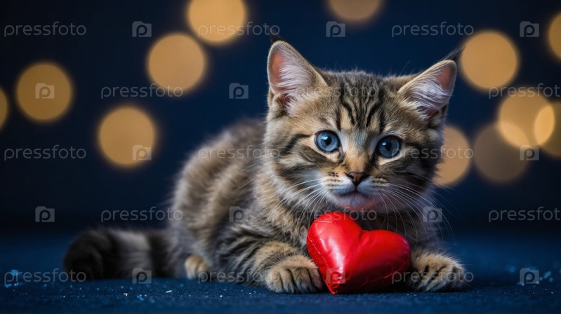 Очаровательный полосатый котенок держит красное сердце на блестящей поверхности с фоном боке, символизирующим любовь и привязанность. День святого Валентина
