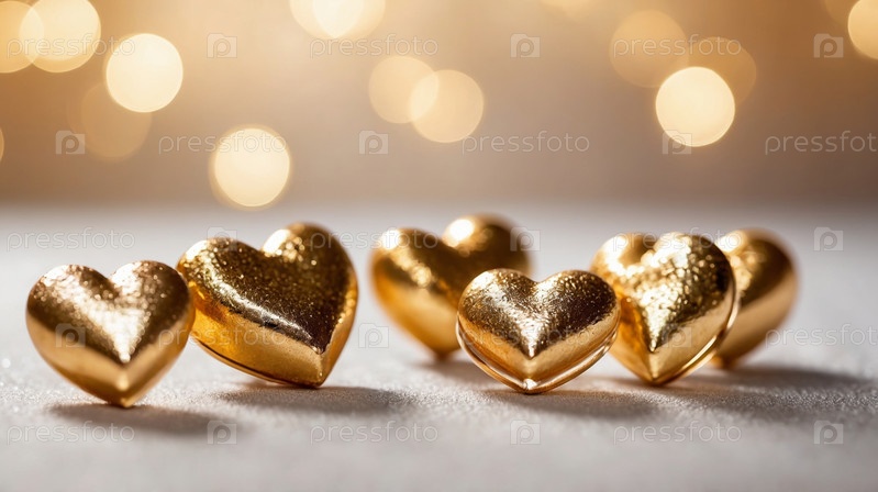 Крупный план золотых украшений в виде сердец на мягком светящемся фоне боке, создающих романтическую и роскошную атмосферу. День святого Валентина