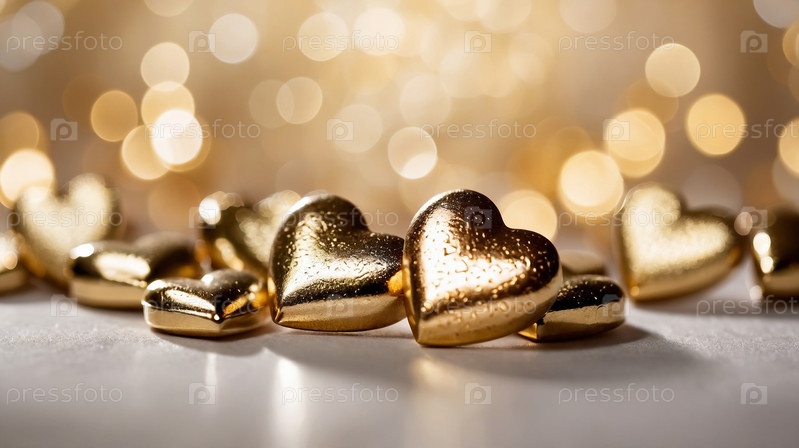 Крупный план золотых украшений в виде сердец на мягком светящемся фоне боке, создающих романтическую и роскошную атмосферу. День святого Валентина
