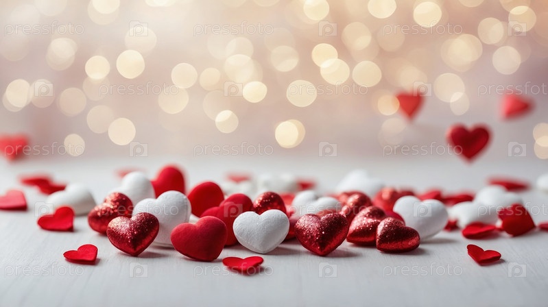 Крупный план красных и белых декоративных сердец на светлой поверхности с золотыми огнями боке, символизирующими любовь и романтику. Фон ко дню святого Валентина