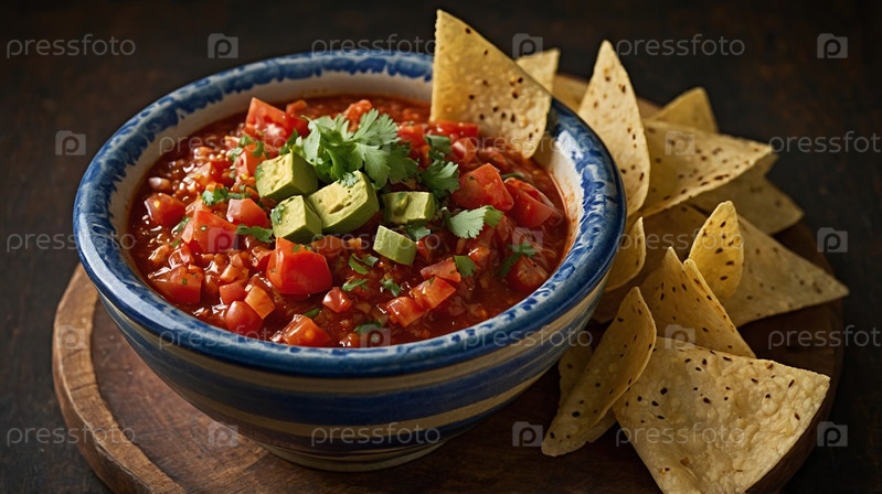 Яркая сальса из рубленых томатов, лука и халапеньо украшена кинзой и лаймом, а также подается с хрустящими чипсами из тортильи на темной деревянной поверхности