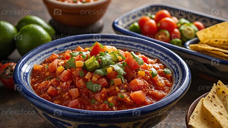 Яркая сальса из рубленых томатов, лука и халапеньо украшена кинзой и лаймом, а также подается с хрустящими чипсами из тортильи на темной деревянной поверхности