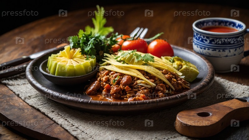 Ароматная тарелка с традиционными блюдами, включающая рис со специями, украшенный свежими овощами, подается с цитрусовыми, авокадо и теплым напитком на деревянном столе