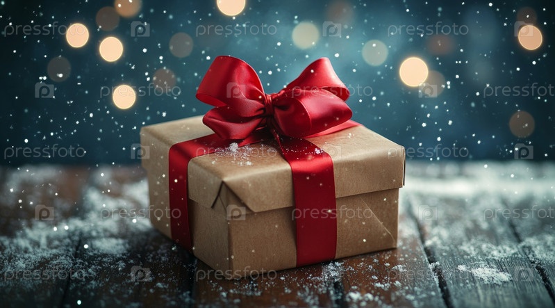 Праздничная подарочная коробка, украшенная красным бантом, стоит на деревянной поверхности во время зимнего снегопада