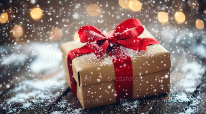 Праздничная подарочная коробка, украшенная красным бантом, стоит на деревянной поверхности во время зимнего снегопада