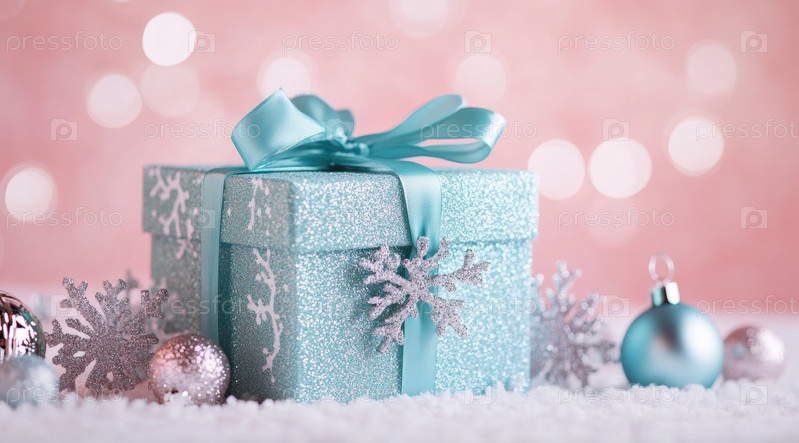 Красиво упакованная голубая подарочная коробка с атласной лентой стоит среди сверкающих украшений и мягкого мерцания огней, отдавая дань праздничному настроению