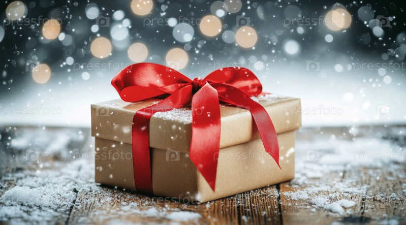 Праздничная подарочная коробка, украшенная красным бантом, стоит на деревянной поверхности во время зимнего снегопада