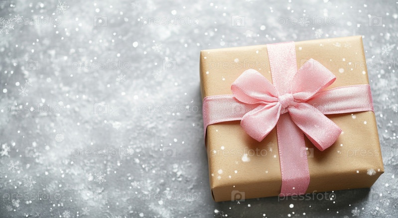 Подарок, завернутый в коричневую бумагу с розовой лентой, лежит на заснеженной поверхности во время зимнего праздника