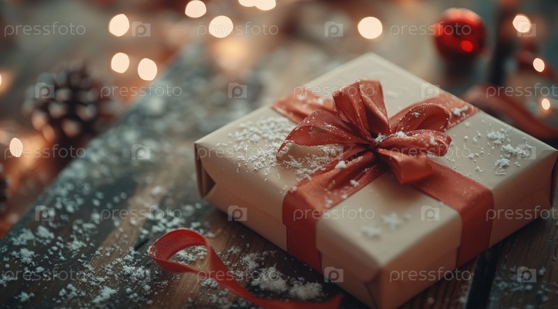 Изящно упакованная подарочная коробка стоит на деревенском деревянном столе, окруженная теплым светом огней, что создает уютную, праздничную атмосферу