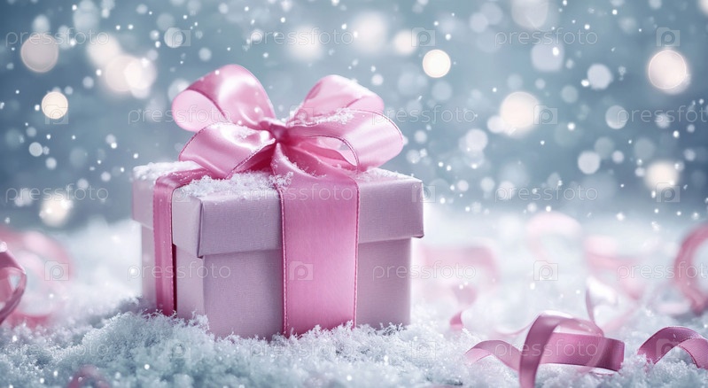 Красиво упакованная подарочная коробка стоит на поверхности, покрытой снегом, сверкающими огнями и падающими снежинками, создающими праздничную атмосферу