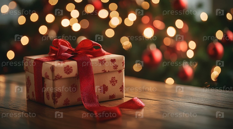 Изящно упакованная подарочная коробка стоит на деревенском деревянном столе, окруженная теплым светом огней, что создает уютную, праздничную атмосферу
