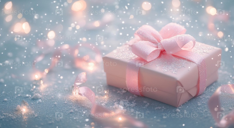 Подарок, завернутый в коричневую бумагу с розовой лентой, лежит на заснеженной поверхности во время зимнего праздника