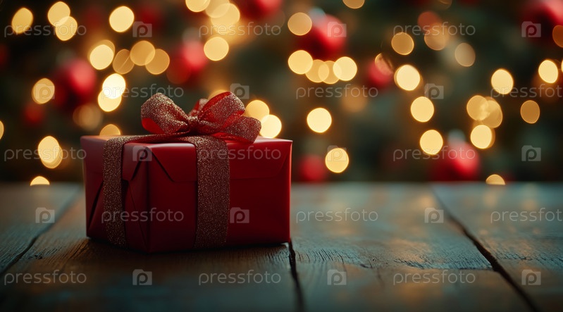 Изящно упакованная подарочная коробка стоит на деревенском деревянном столе, окруженная теплым светом огней, что создает уютную, праздничную атмосферу