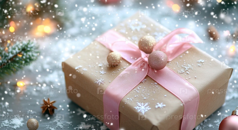 Подарок, завернутый в коричневую бумагу с розовой лентой, лежит на заснеженной поверхности во время зимнего праздника