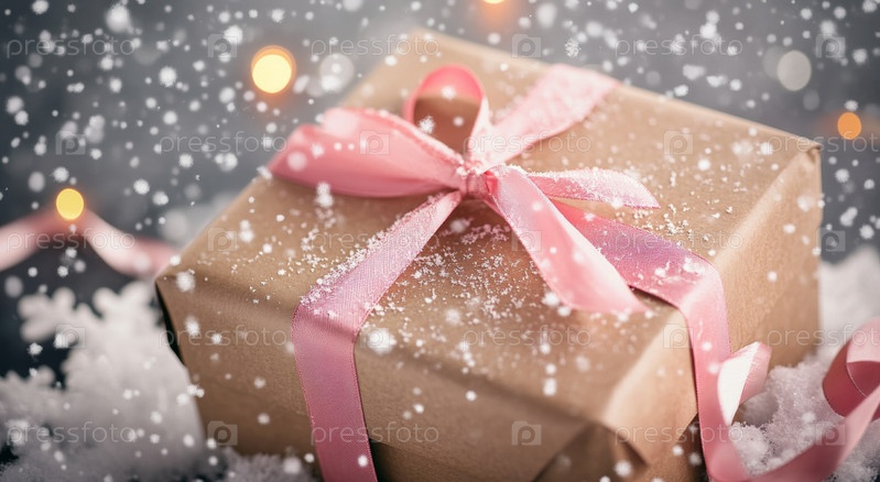 Подарок, завернутый в коричневую бумагу с розовой лентой, лежит на заснеженной поверхности во время зимнего праздника