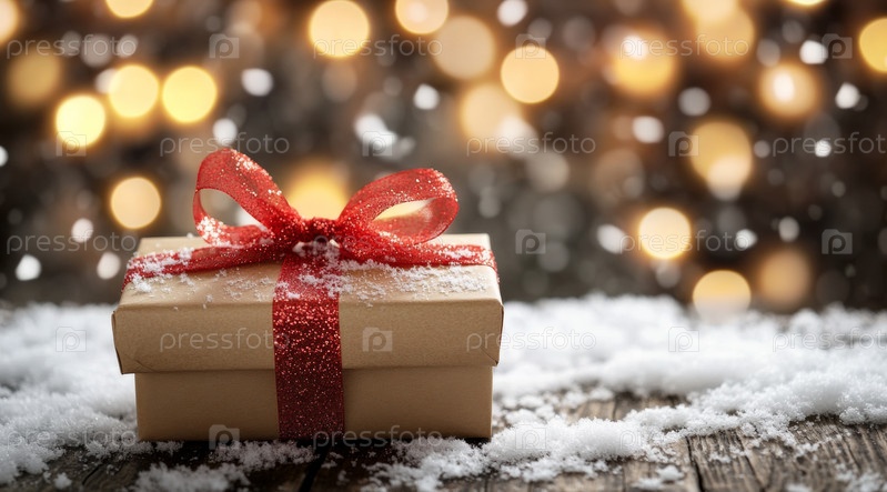 Праздничная подарочная коробка, украшенная красным бантом, стоит на деревянной поверхности во время зимнего снегопада
