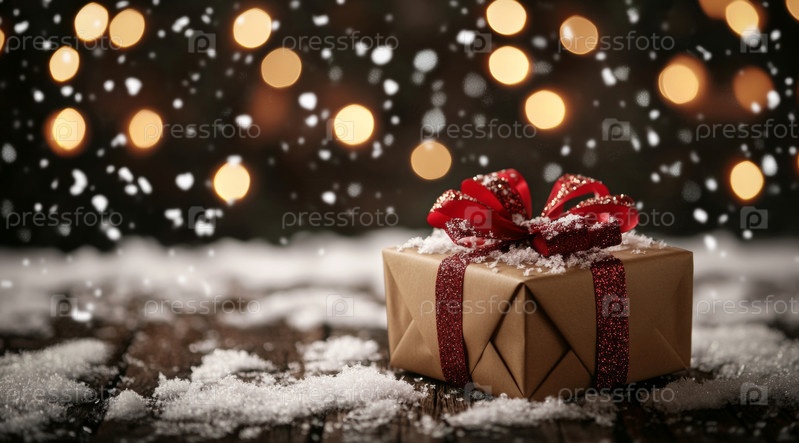 Праздничная подарочная коробка, украшенная красным бантом, стоит на деревянной поверхности во время зимнего снегопада