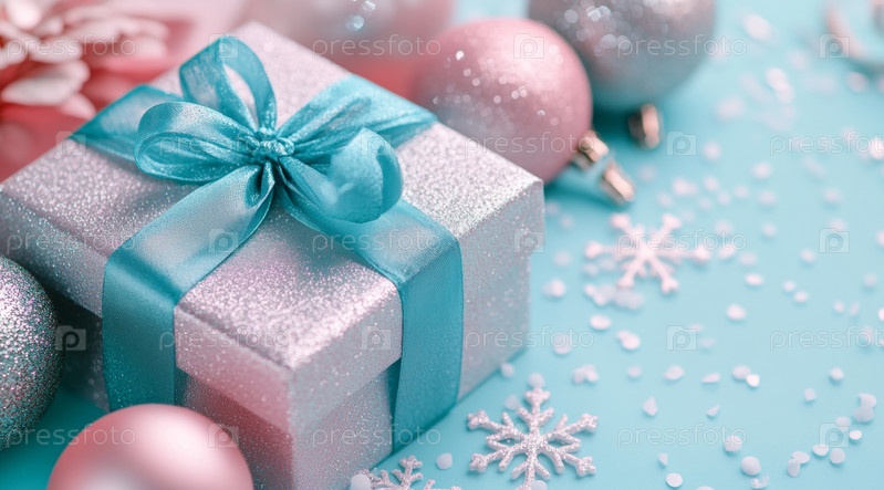 Красиво упакованная голубая подарочная коробка с атласной лентой стоит среди сверкающих украшений и мягкого мерцания огней, отдавая дань праздничному настроению