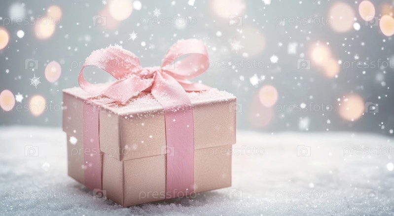 Красиво упакованная подарочная коробка стоит на поверхности, покрытой снегом, сверкающими огнями и падающими снежинками, создающими праздничную атмосферу