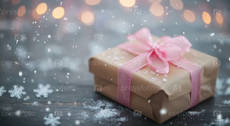 Красиво упакованная подарочная коробка стоит на поверхности, покрытой снегом, сверкающими огнями и падающими снежинками, создающими праздничную атмосферу