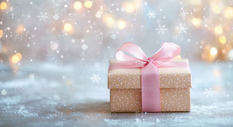 Красиво упакованная подарочная коробка стоит на поверхности, покрытой снегом, сверкающими огнями и падающими снежинками, создающими праздничную атмосферу